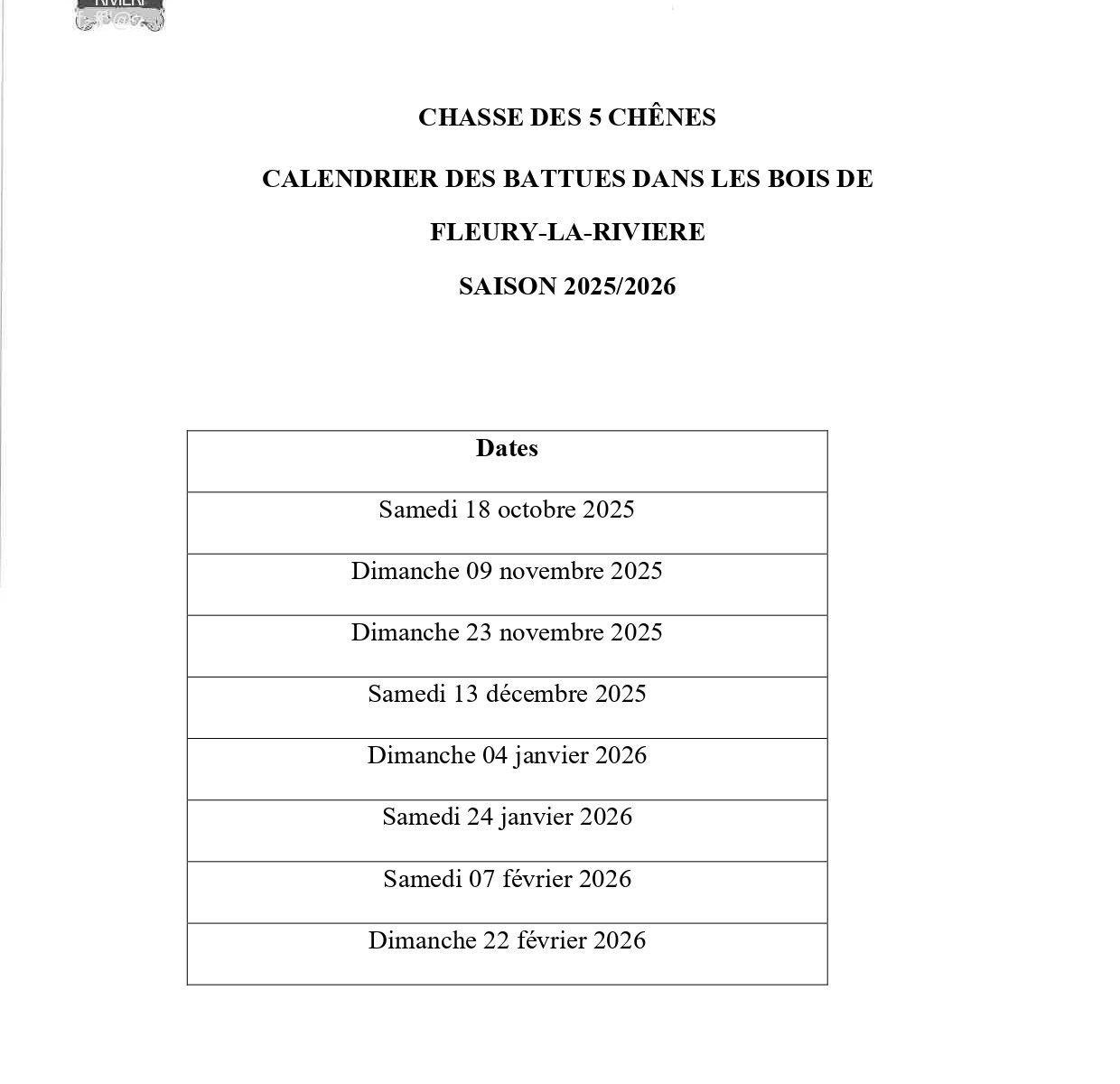 Calendrier de chasse dans les bois de Fleury 2025/2026